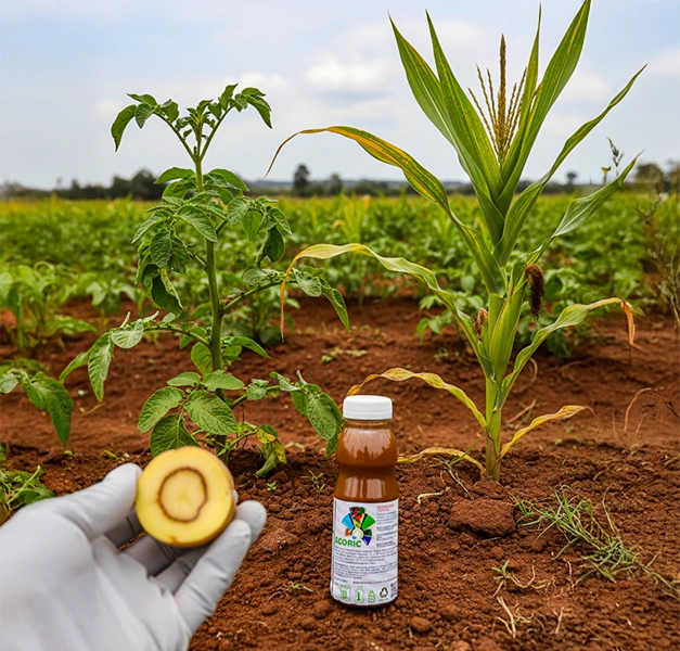 • Seed & Tuber Treatment (The Shield): Before planting, spray potato tubers or soak maize seeds with EcoRic (1-2 L per ton). The Bacillus subtilis BR-1256 creates a protective biofilm around the roots, physically blocking Ralstonia from entering.
